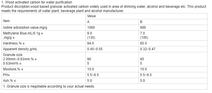 Product discription:wood based granular activated carbon widely used in area of drinking water, alcohol and beverage etc. This product meets the requirements of water plant, beverage plant and alcohol manufacturer.