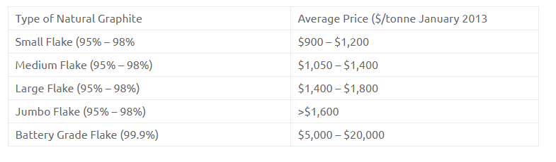 Graphite prices are a function of 2 factors – flake size and purity – with large flake (+80 mesh), high Carbon (+94%) varieties commanding premium pricing.