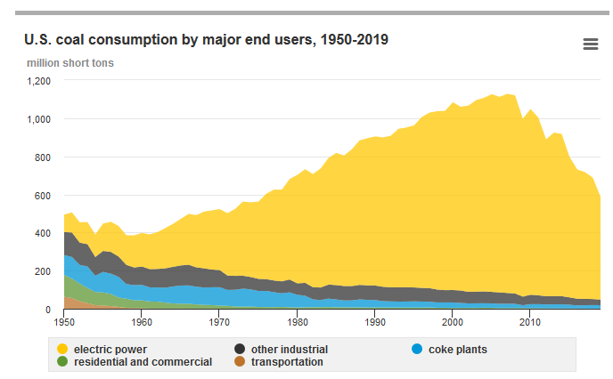 U.S. coal consumption peaked in 2007 and declined in most years since then, mainly because of a decline in the use of coal for electricity generation.