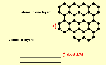 Graphite has a layer structure which is quite difficult to draw convincingly in three dimensions. The diagram below shows the arrangement of the atoms in each layer, and the way the layers are spaced.